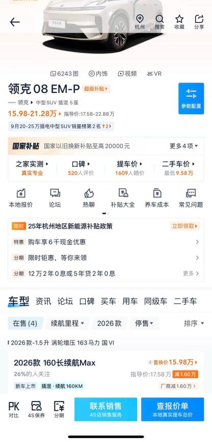 在购车决策过程中,除了产品力和交付速度外,价格因素同样重要。全新领克08 EM-P通过一系列优惠政策,为消费者提供了更加省心的购车方案。限时售价15.98万元起,同时提供6000元现金优惠、10000元焕新补贴以及12万2年0息金融方案,综合权益价值至高近7万元。这些优惠政策截止时间为10月31日,为消费者提供了难得的购车时机。对于家庭用户而言,选择全新领克08 EM-P不仅意味着能够更快提车、享受高品质出行生活,更意味着能够直接节省数万元成本,实现真正的“早买早省”。