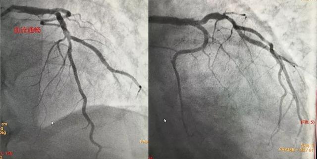 很快心电图提示急性广泛前壁心肌梗死,立刻给患者口服双联抗血小板药物以抗血栓,并请心内科值班主任会诊,明确诊断。接着就是谈话签字、启动导管室,尽快冠脉造影明确血管病变。大约30分钟后完成冠状动脉造影检查。