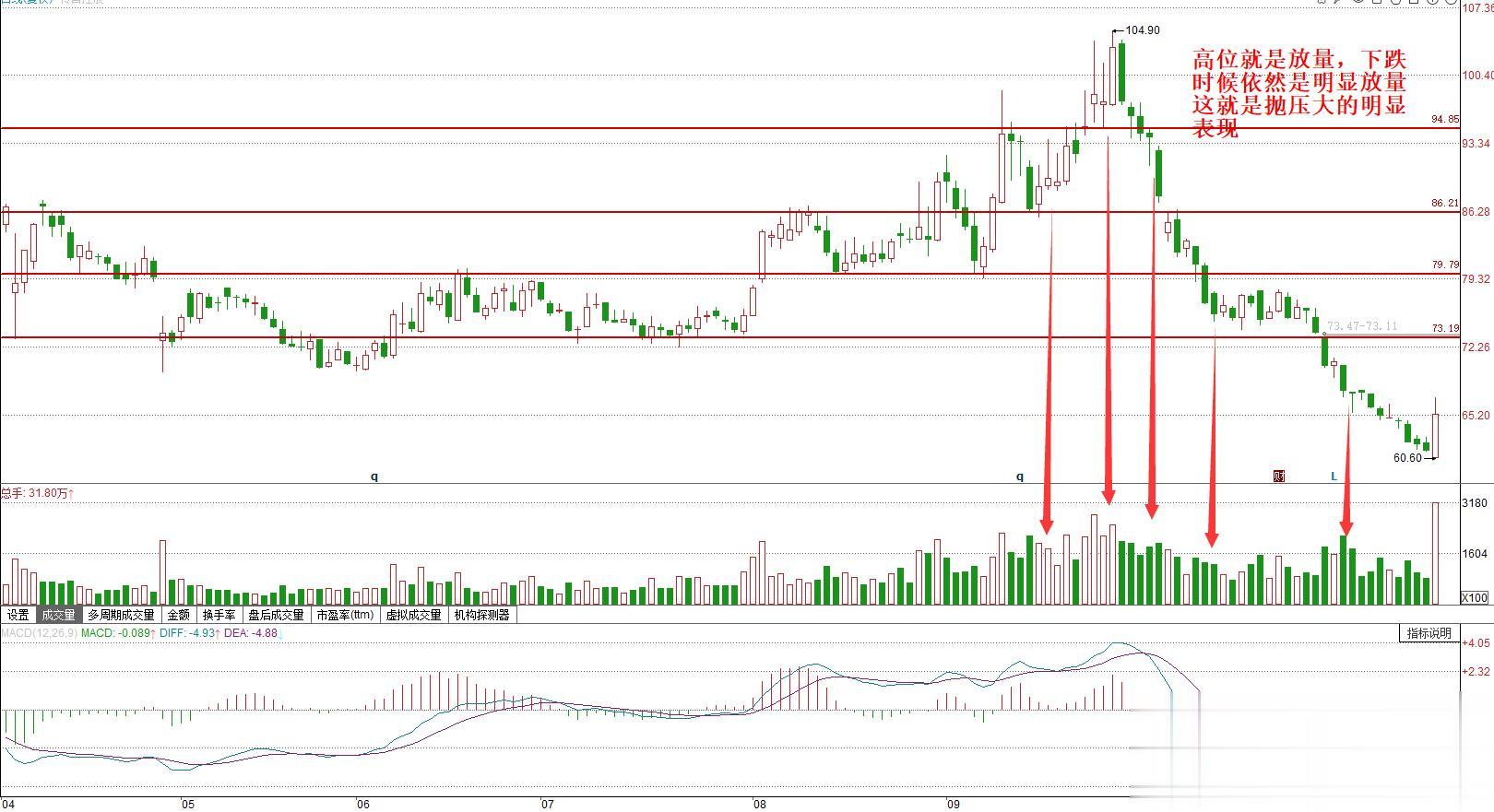 所以当股价在高位出现放量之后,并且破位了,那么这种就是典型的抛压大表现,而在后面下跌过程中,如果没有明显的缩量,而是一直处于一个放量状态,那么就说明这种位置在下跌过程中,一直是抛压明显比较大的。