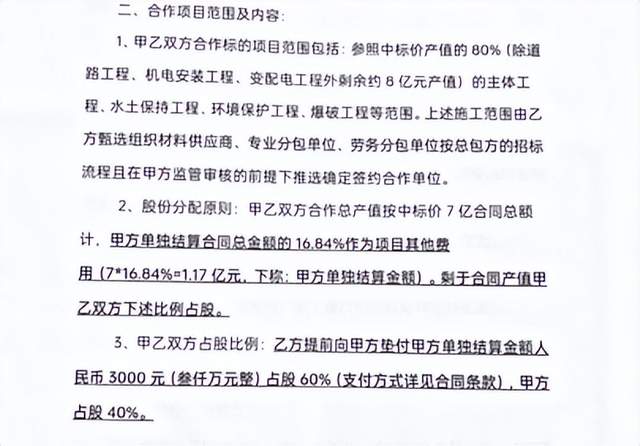 刘诗情及壹心建设工程有限公司负责人朱文骏提供的一份项目施工合作协议显示,壹心建设工程有限公司与张某军建筑劳务公司合作,张某军支付3000万元在项目合同产值占股60%,刘国富和张某军二人在落款处签字。