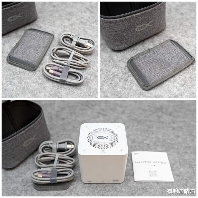 零刻Mate Pro的开箱走简约实用路线,拆开外包装第一眼就是原厂标配的灰色收纳包,无冗余配件和装饰,完全贴合数码设备的实用调性。打开收纳包拉链,内部是规整的左右分区,空间规划紧凑不浪费,左边扩展坞主机上直接放着说明书,拿取方便,右侧通过带魔术贴的隔板隔开电源线、双USB-C线和HDMI线,所有配件都被牢牢固定,运输中不会晃动磕碰,整体体积控制出色,塞进日常背包或旅行箱都不占地方,出行携带很友好。