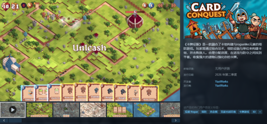 3.《Card Conquest》,融合卡牌构筑和肉鸽的塔防,可以使用法术,收集遗物强化卡牌。