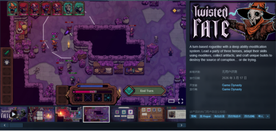 5.《Twisted Fate》,回合制肉鸽,指挥三位英雄组成的小队,每个英雄有4项可通过修改器调整的技能,每局打造不同build。