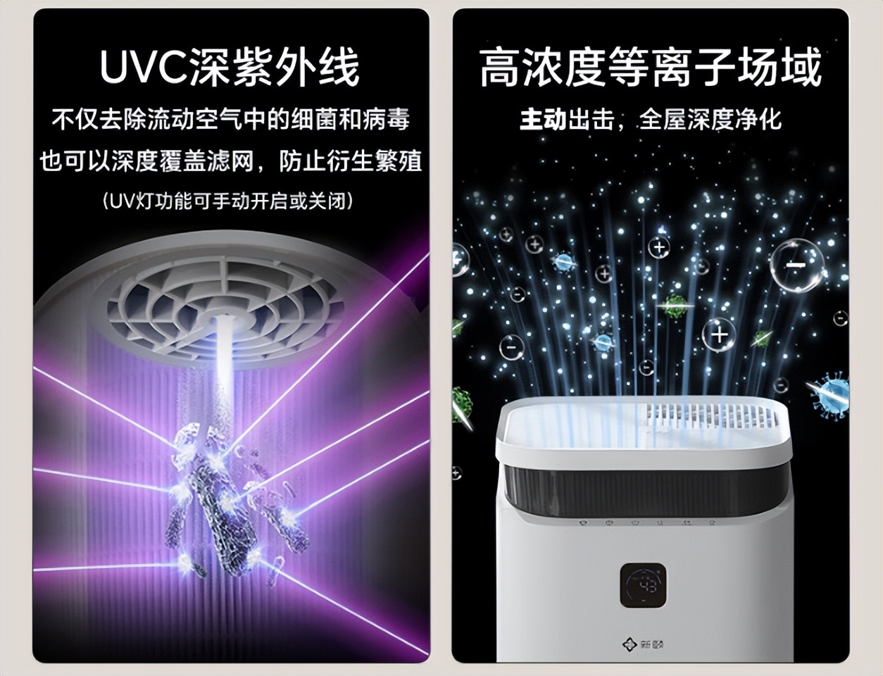 机身内部搭载隐藏式 UV-C 杀菌灯(波长 254nm),设计在 HEPA 滤网出风口侧,避免紫外线直射伤害: