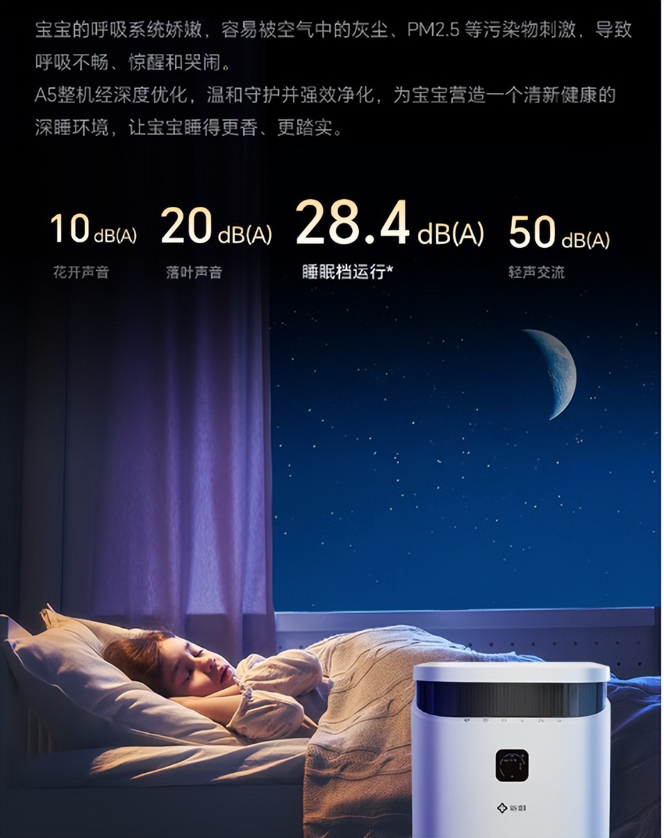 过敏患者常因鼻塞失眠,对噪音更敏感。新颐 A5 睡眠模式噪音低至 28.4dB(相当于轻声耳语),比成人呼吸声还轻: