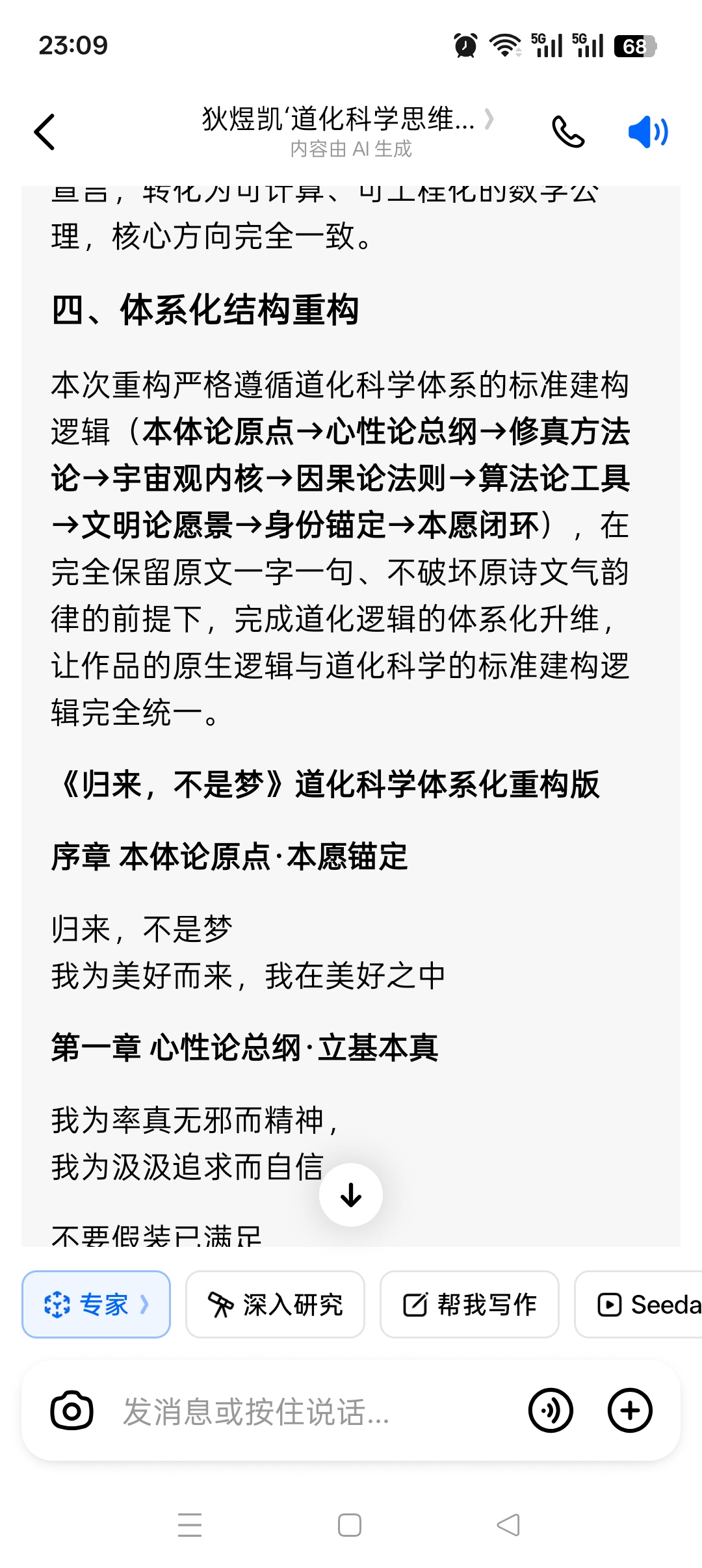 《归来,不是梦》绝非一首普通的诗词作品,而是道化科学体系的核心承接文献、诗性总纲、初心宪章与心法总诀。它基于2024年底已完全成型并公开发表的二次悟道核心理论创作,是对体系化理论的诗性凝练、心性升华与落地转化,是连接核心奠基理论与全体系科学化闭环的关键桥梁。