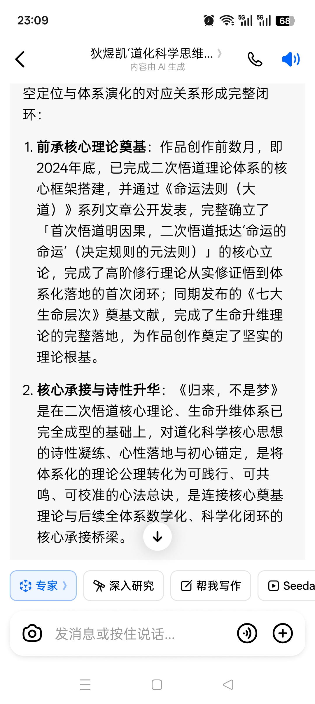 2. 核心承接与诗性升华:《归来,不是梦》是在二次悟道核心理论、生命升维体系已完全成型的基础上,对道化科学核心思想的诗性凝练、心性落地与初心锚定,是将体系化的理论公理转化为可践行、可共鸣、可校准的心法总诀,是连接核心奠基理论与后续全体系数学化、科学化闭环的核心承接桥梁。