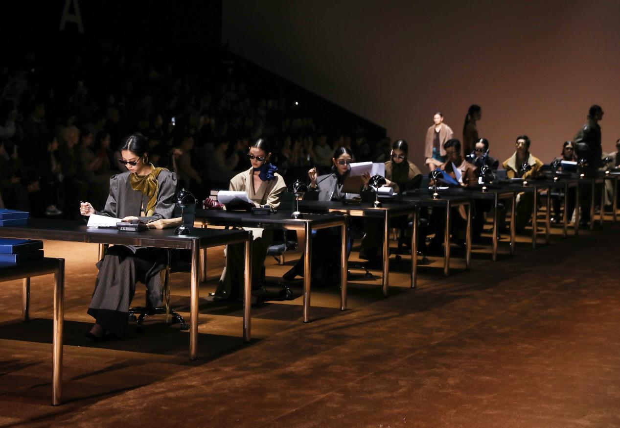 定格1980年代的职场剪影,女性们踩着利落步履闯入由男性主导的职场天地,在刻板规则与阶层壁垒中,默默积攒破局力量。J RUREMINDS 26秋冬系列,以秀场复刻年代职场,整齐排布的员工工位与反向陈设的领导办公桌相对而立,冷调场景里满是传统职场的压抑与博弈感。