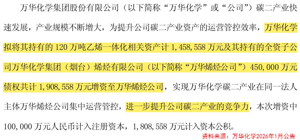 1月30日,万华化学宣布将其持有的高达149亿元的120万吨乙烯一体化资产和45亿元万华烯烃债权,增资至万华烯烃公司,增资金额高达191亿元。