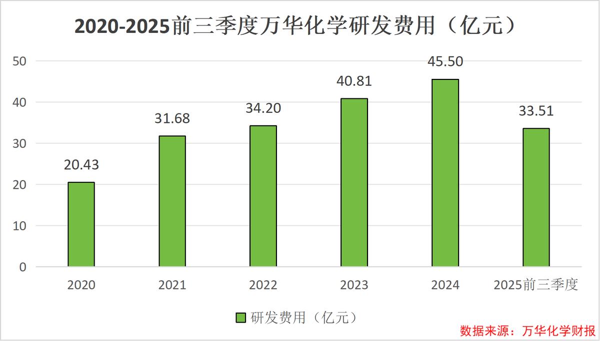 2020到2024这五年内,万华化学累计研发投入达到173亿元,2025年前三季度,公司研发投入达到33.51亿元,同比增长11.51%。