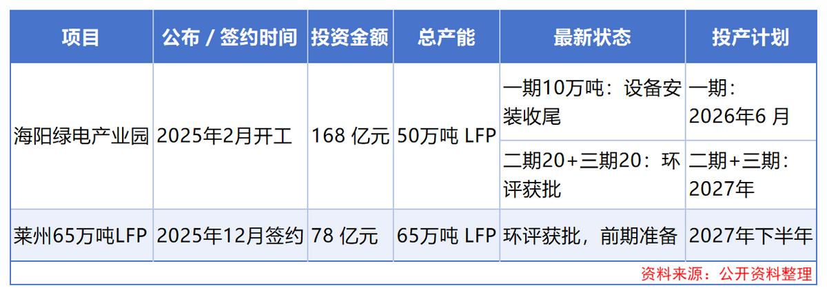 此外,海阳绿电产业园一期10万吨磷酸铁锂也将于2026年6月投产。