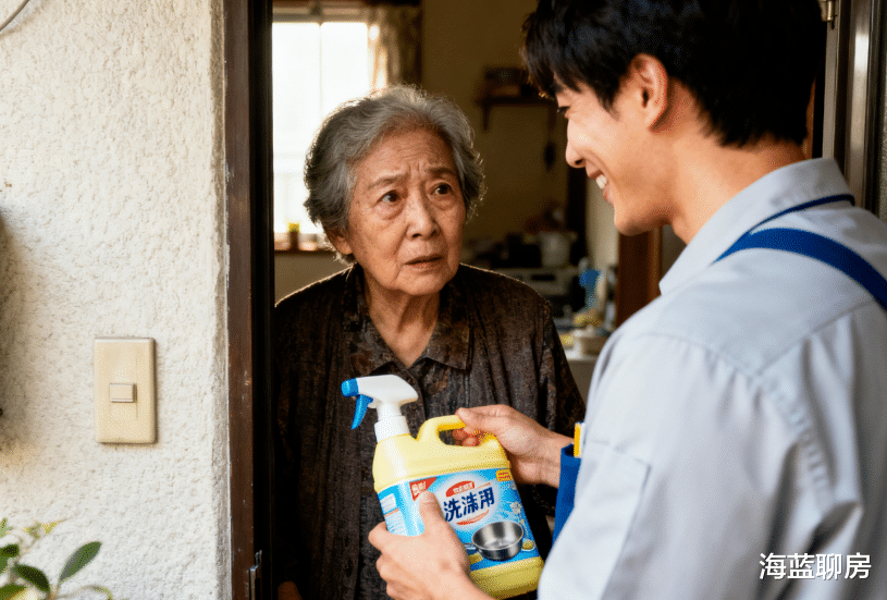 可她们不去清洗油烟机,反而用清洁剂处理起墙面上的陈年老渍,同时向奶奶推销洗洁剂。