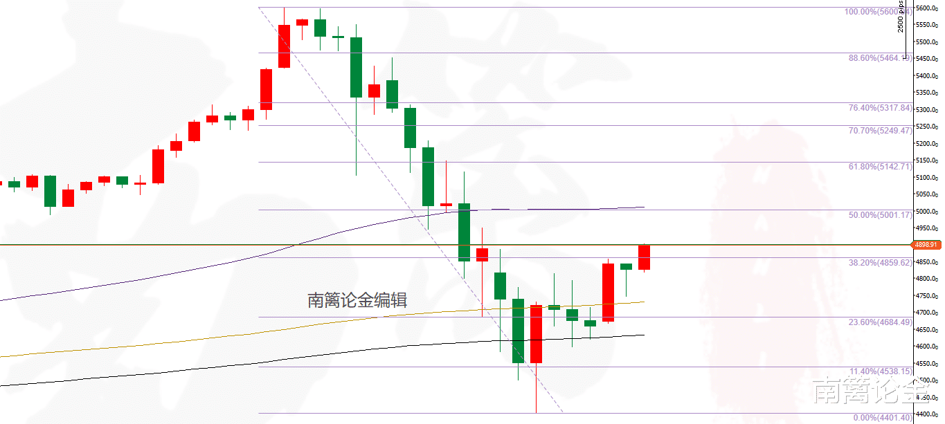 从高位5597至本轮下跌低点4403拉一出斐波那契的回调线,周一开盘后实体部分就被挡在了斐波那契38.2%的4860一带,3号上午,行情再次重走,说明这个斐波那契是拥有部分参考意义的。