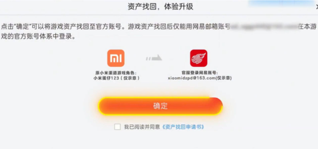 接着是比较重要的一步。需要我们仔细核对左边的小米渠道服角色ID和右边的网易账号,一定要确认是自己需要转移的目标对象,确认无误后点击【确定】按钮。