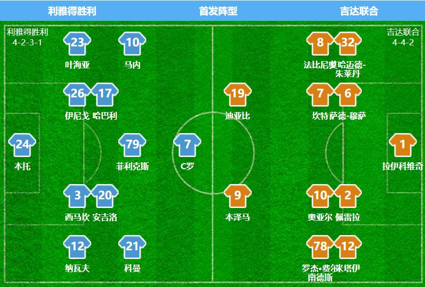 利雅得胜利vs吉达联合,热苏斯排出4231阵型,首发身价1.2亿欧元,C罗、菲利克斯、马内、科曼组成进攻四叉戟;孔塞桑排出442阵型,首发身价1.1亿欧元,本泽马、迪亚比、奥亚尔、坎特、法比尼奥等球星也悉数首发。