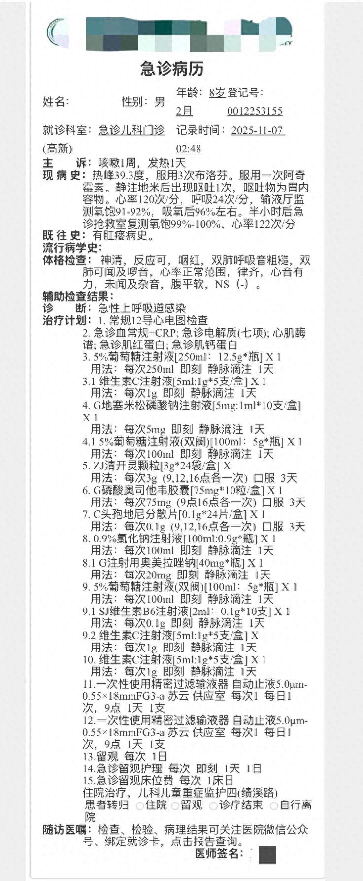 查血后,医生抽血检查诊断是病毒感染,可是吊水(地塞米松)过程中娃呕吐,停止吊水,医生开始给他上了监护,发现血氧92,心率133,再次安排了心电图,抽血检查,娃已经走不动路,推着轮椅做各种检查!在急救中心监护到早八点,娃各种指标接近正常,此时仍然发烧38度!