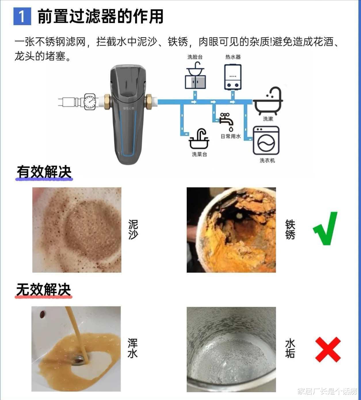 前置过滤器: 全屋用水的“守门员”,过滤泥沙、铁锈等大颗粒杂质。