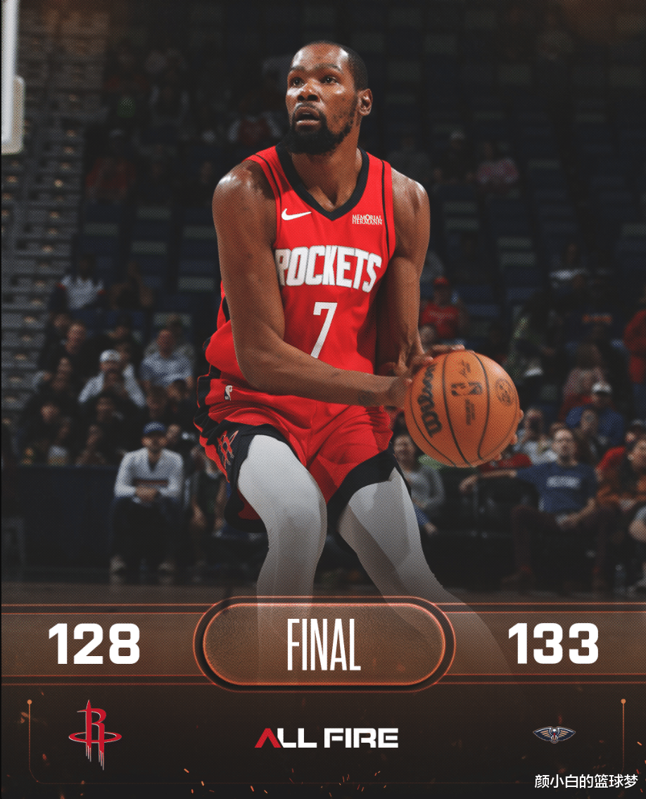 火箭在一度领先西部倒数第一鹈鹕25分的情况下被逆转了,这场比赛堪称联盟截至目前最大的冷门,因为两队的硬实力差距非常明显,上半场火箭专注度在时鹈鹕得分都困难,可下半场火箭过于放松就被鹈鹕各种追分,进入加时赛更是被鹈鹕轻松反超,阿门、小贾、申京各种打铁只有KD一人能得分,可绝平的三分却到不了KD手上。