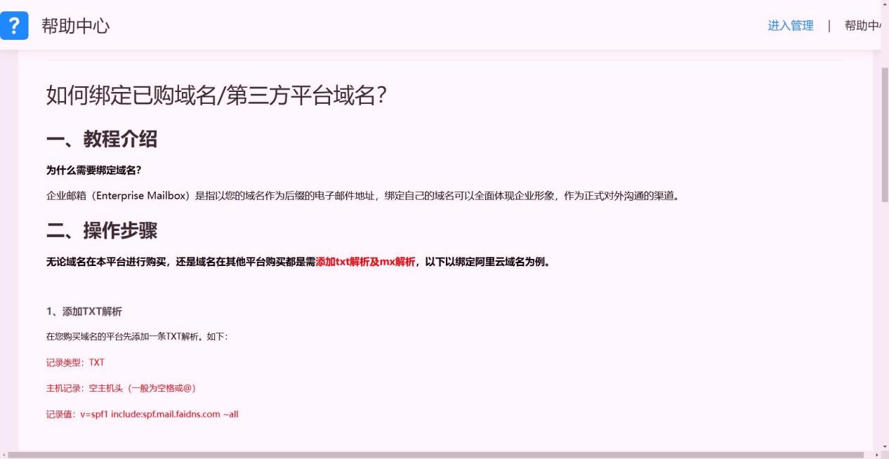 绑定第三方域名有哪些注意事项?不支持中文域名,个人或企业实名认证的域名均可,支持二级域名;需先添加TXT和MX解析,等待5-10分钟生效;若域名已有@主机记录网站解析,可切换@mail.域名为邮箱账号,避免解析冲突。