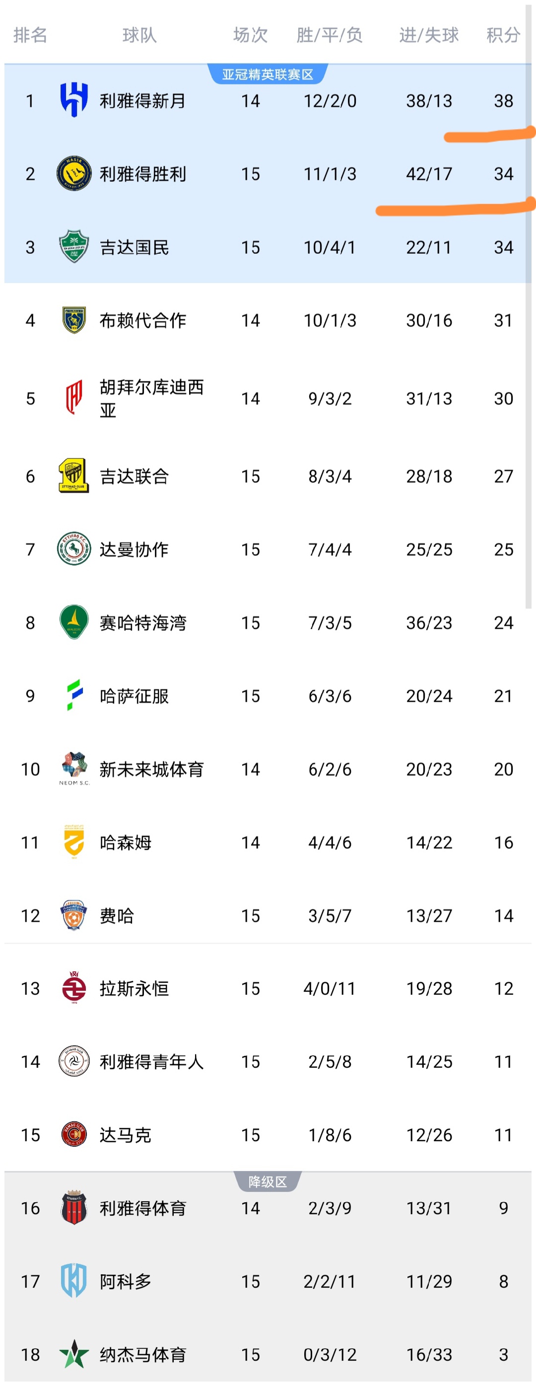昨晚至今天凌晨,沙特联第16轮结束三场较量,利雅得胜利、吉达国民等队出战,这些比赛结束之后,沙特联积分榜更新,我们来看看。