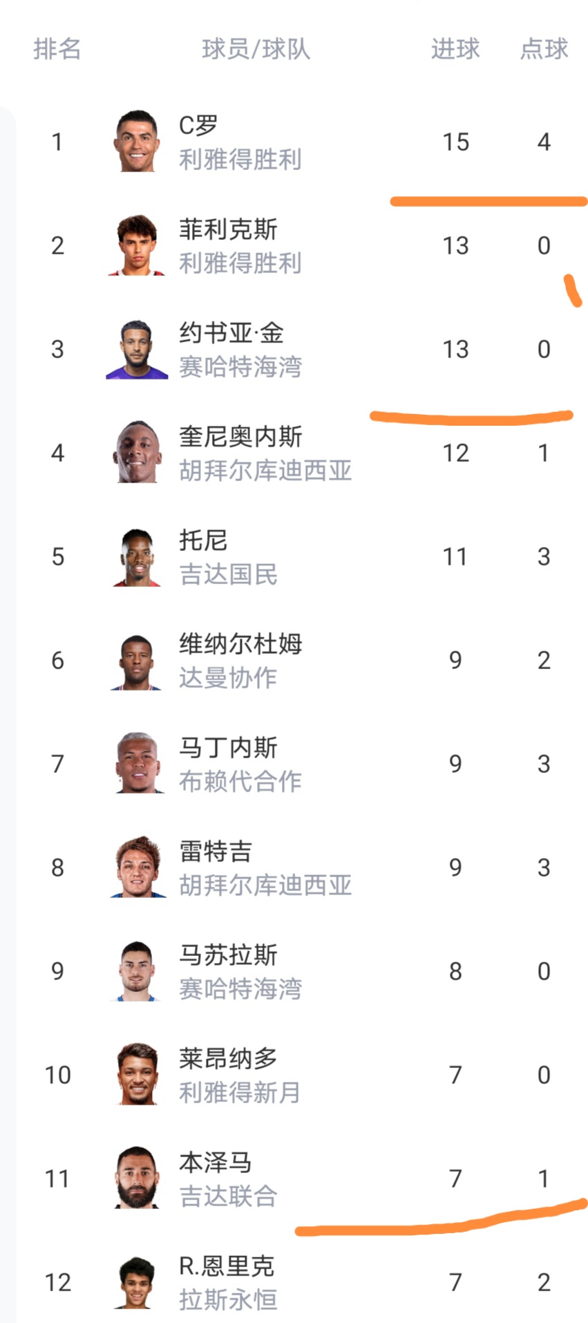 射手榜方面,C罗连续哑火,进球数依然是15个,菲利克斯和约书亚都是13个进球,可以看到C罗的领先优势不是很大,沙特联金靴的争夺很是胶着啊。