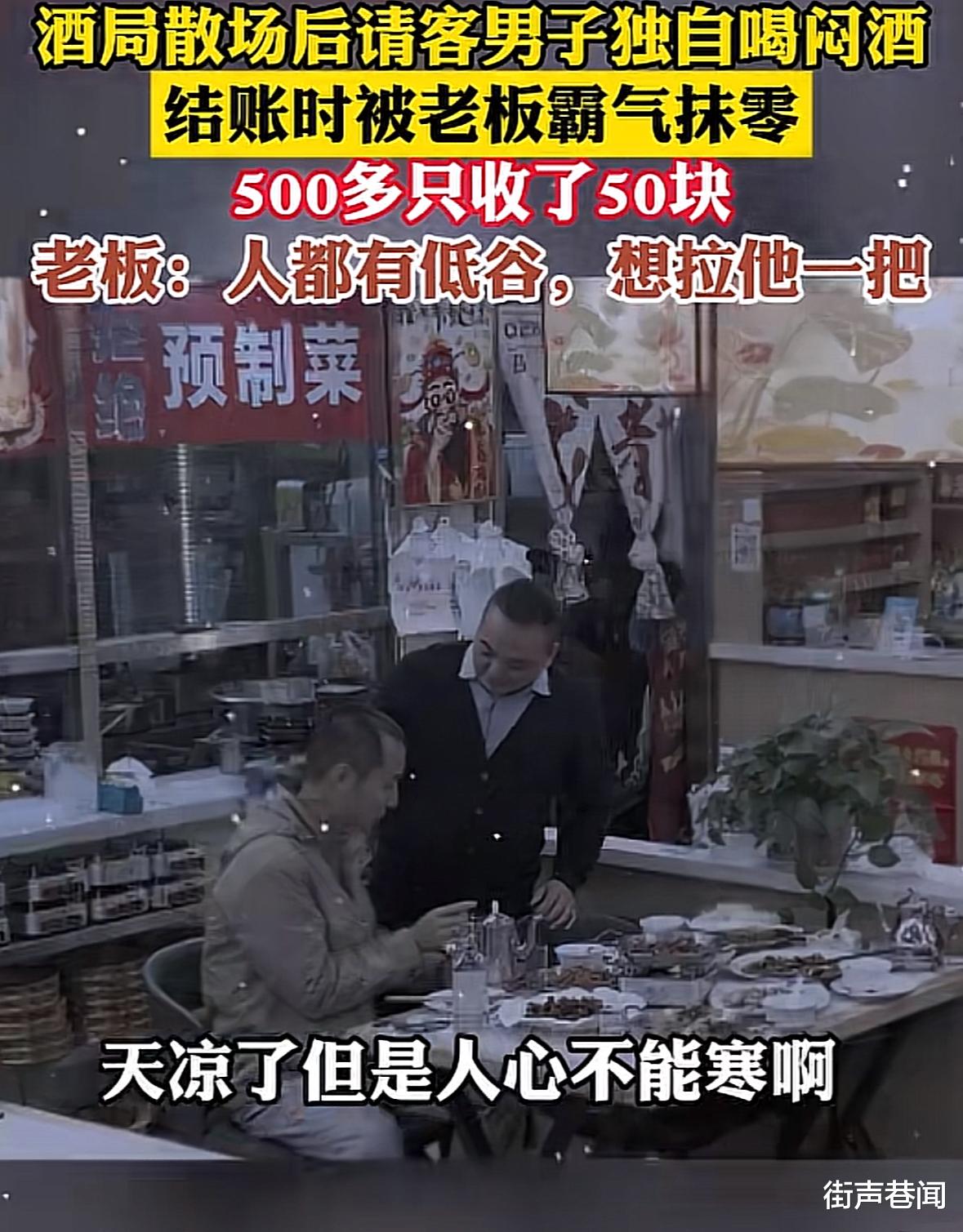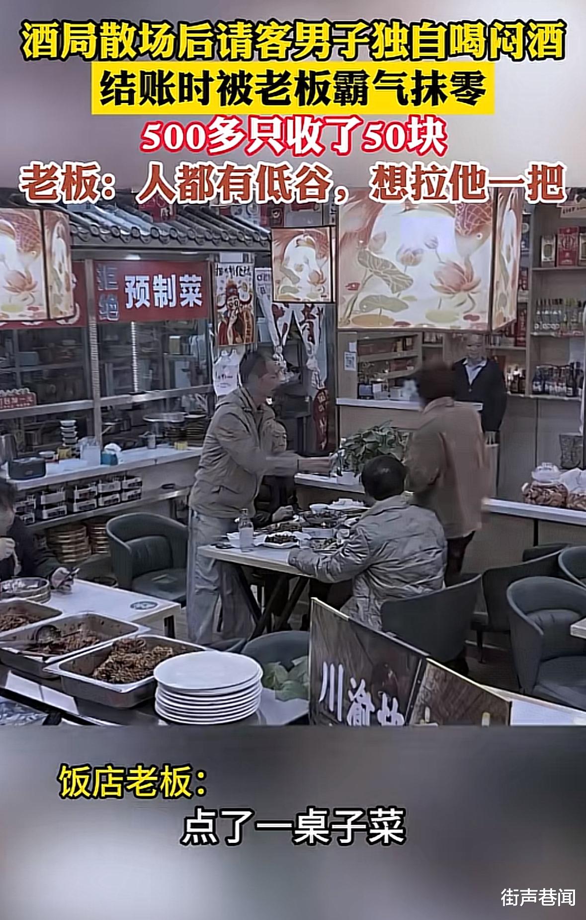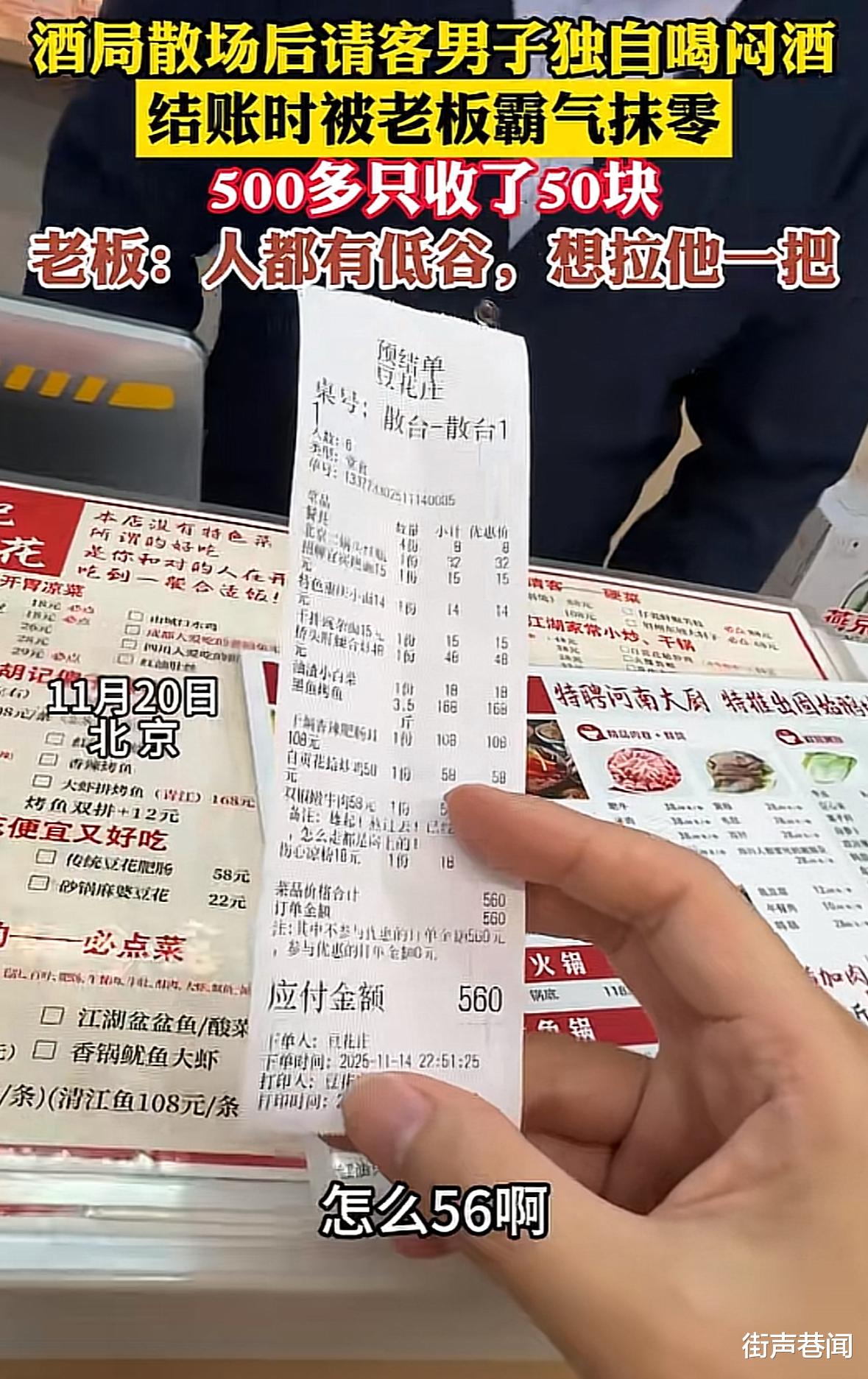 男子一个人坐着喝闷酒,被老板看见后,老板霸气抹零,560 块钱只收 56 块钱!