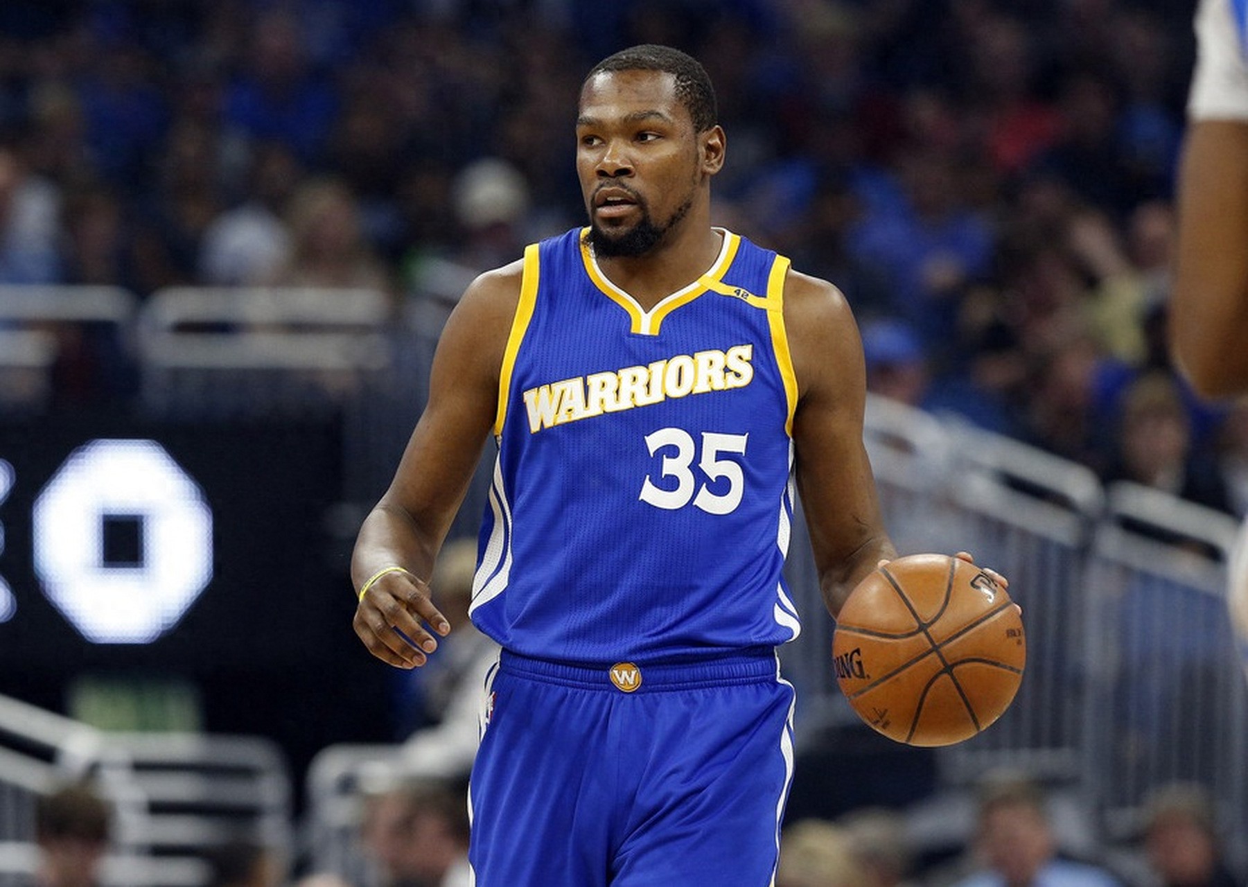 就在这场比赛第三节还剩5分38秒时,杜兰特在右侧45度接球,面对温德尔·卡特的防守,干拔三分命中。球进的那一刻,现场的比分牌变成了81平,而大屏幕上打出了一行字: