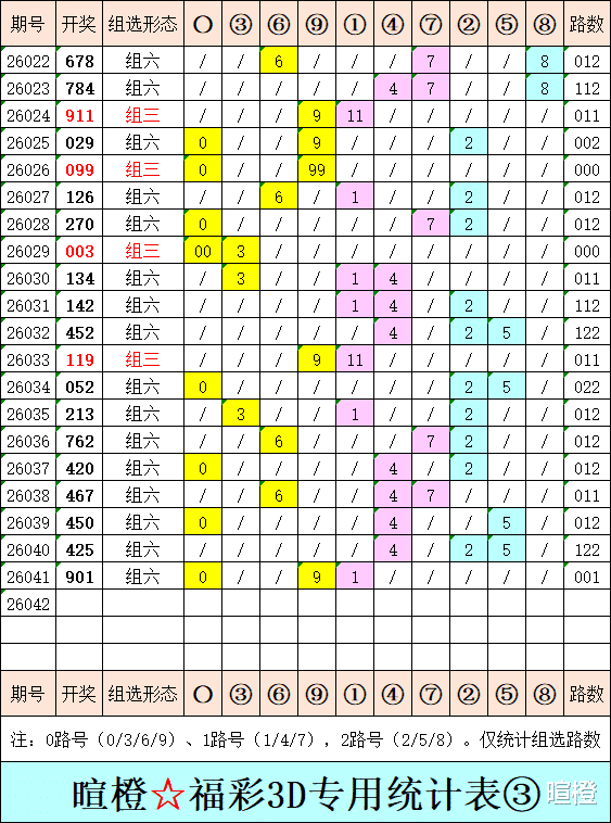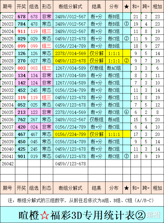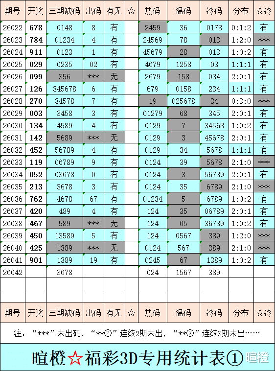 26042期:暄橙福彩3D综合条件(本期将在2月11日21:15开)一、上期回顾 ☆1、上期开奖号:9 0 1。2、和值= 10,跨度= 9。3、常态组六,001路组合。4、热度分布(热:温:冷)1:0:2。二、本期条件 ☆1、三期缺码:3678。2、热:024,温:1567,冷:389。3、断组分解式:0459//123-678。4、四胆:3478;三胆:378。三、术语解释 ☆1、三期缺码:0至9这十个自然数当中,未在近三期开奖号出现的数字。2、热度(热温冷):自然数0至9,在近七期开奖号中,出现3次及3次以上的数字,称为热码;出现2次的数字,称为温码;出现1次和未出现的数字,称为冷码。某个数字在开奖号中出现几个,就按几次计算。3、断组分解式:将0至9这十个自然数,分成三组数字,从前往后依次为A组(4码)、B组(3码)、C组(3码),一般情况下,有一组数字不出码,偶尔会有两组数字不出码。A组不出码的情况相对较少。断组为主,分解为辅。4、常态组六号码:同时包含大数、小数、奇数、偶数、质数、合数的组六号码,共有72注。统计表中,简称“常态”。5、非常态组六号码:全大数、全小数、全奇数、全偶数、全质数、全合数等六种形态的组六号码,共有48注。统计表中,简称“非常”。★提醒:彩市有风险,参与须谨慎!水平有限,仅供参考!