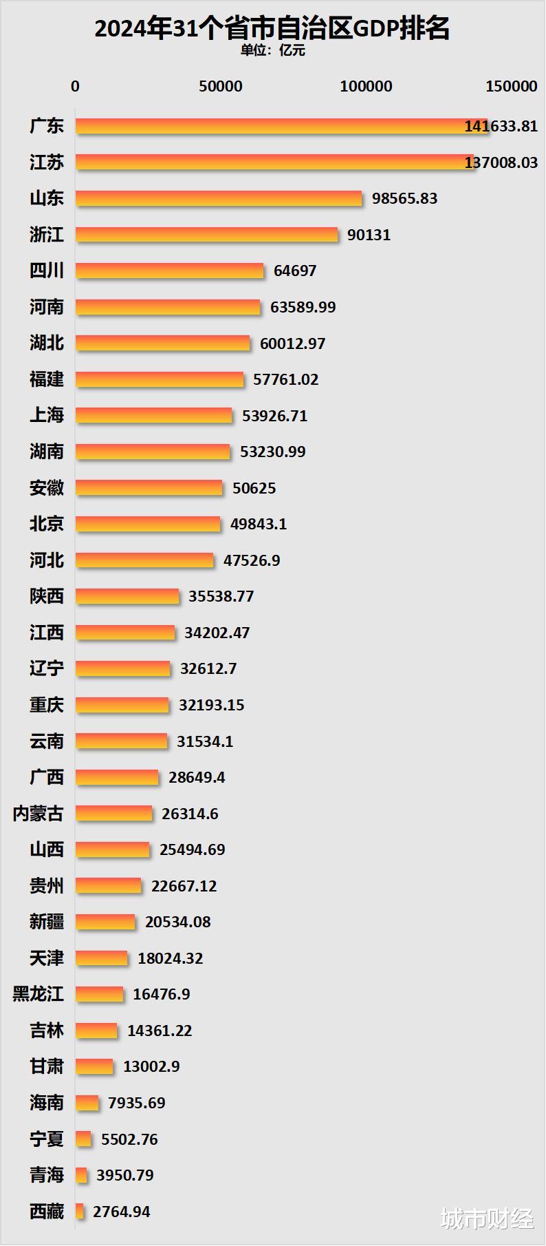 从各省经济第一城之间的差距,同样能看到地区之间经济的极度不平衡。
