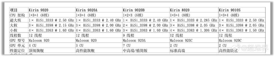两款芯片的唯一区别在于,麒麟9020A的大核与中核频率较主版本降低了100MHz,性能差距仅5%,几乎可忽略不计。