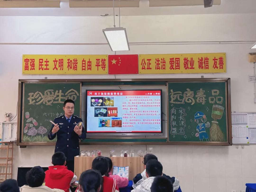 六(7)班家长带来“珍爱生命 拒绝毒品”的宣传讲座,让孩子知道什么是毒品,毒品对人体、家庭和社会的危害,引导孩子从小树立憎恨毒品、远离毒品的意识,树立自我保护意识和责任意识。为自己、为家人和社会构建一道坚强防线。