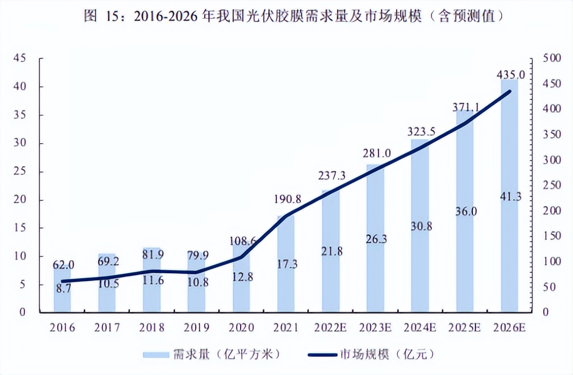 2021年,全球封装胶膜市场需求约21亿平方米,同比增长28.0%。预计2025年,我国光伏胶膜市场规模将达到371.1亿元。