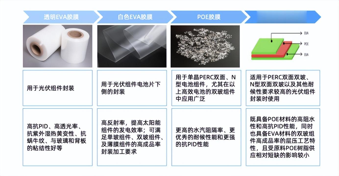 POE胶膜是以POE树脂为主要原料,通过添加合适的加工助剂制成的薄膜。相比于EVA胶膜,POE胶膜的安全性更强,优异的水汽阻隔能力使得其透水率只有同等厚度EVA胶膜的八分之一左右,大幅提升了光伏组件的耐候性,特别适合对水汽敏感的电池片封装以及在潮湿环境下工作的光伏组件。同时由于POE分子链结构稳定,老化过程中不会分解产生酸性物质,故具有优异的抗老化性能。此外,POE胶膜较EVA胶膜具有更强的抗PID性能,使用POE胶膜进行封装可以有效地避免PID现象,提高光伏组件长期可靠性,这些优异的性能使得POE胶膜成为双面光伏组件封装的首选材料。