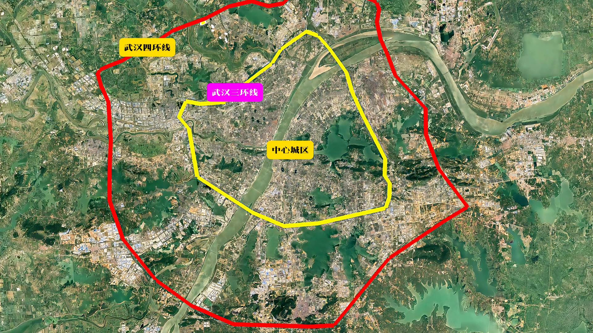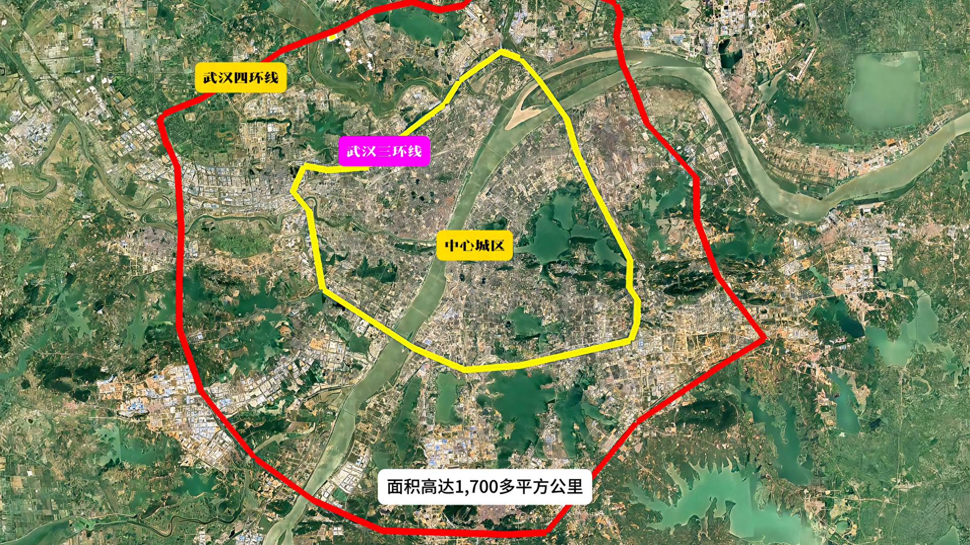 ·首先看到的是武汉市三环线和四环线包围的城市建成区。三环线以内为传统的市中心,面积大约520多平方公里。四环线内为武汉市的城市发展区,面积高达1700多平方公里,但还有很多地方没有城市化。