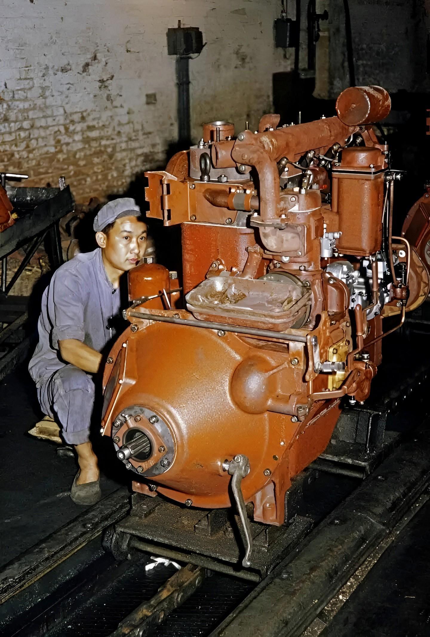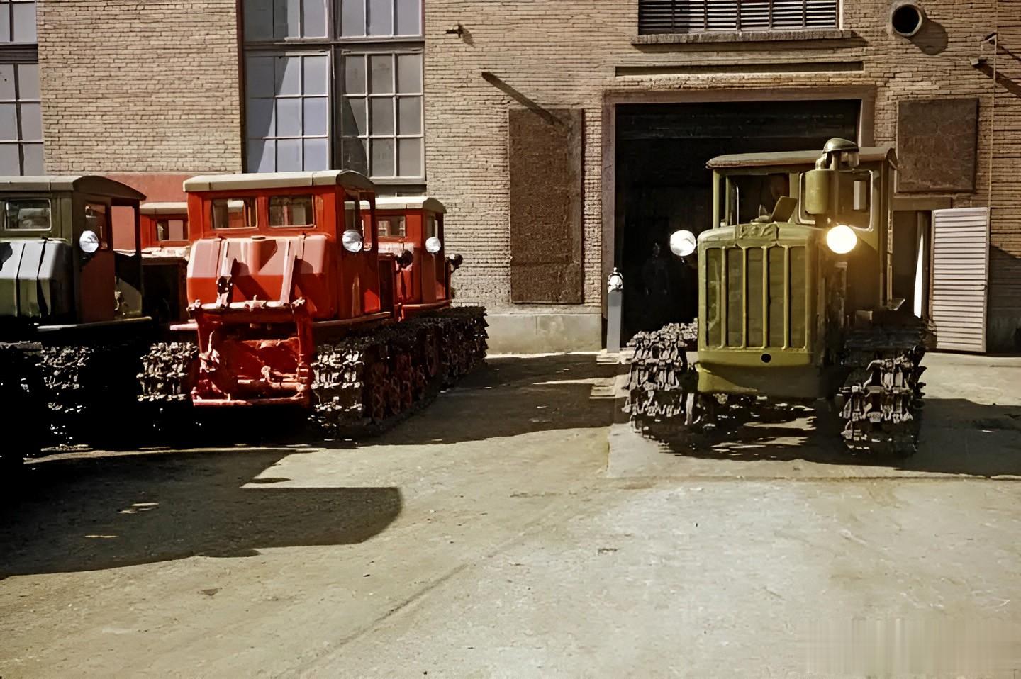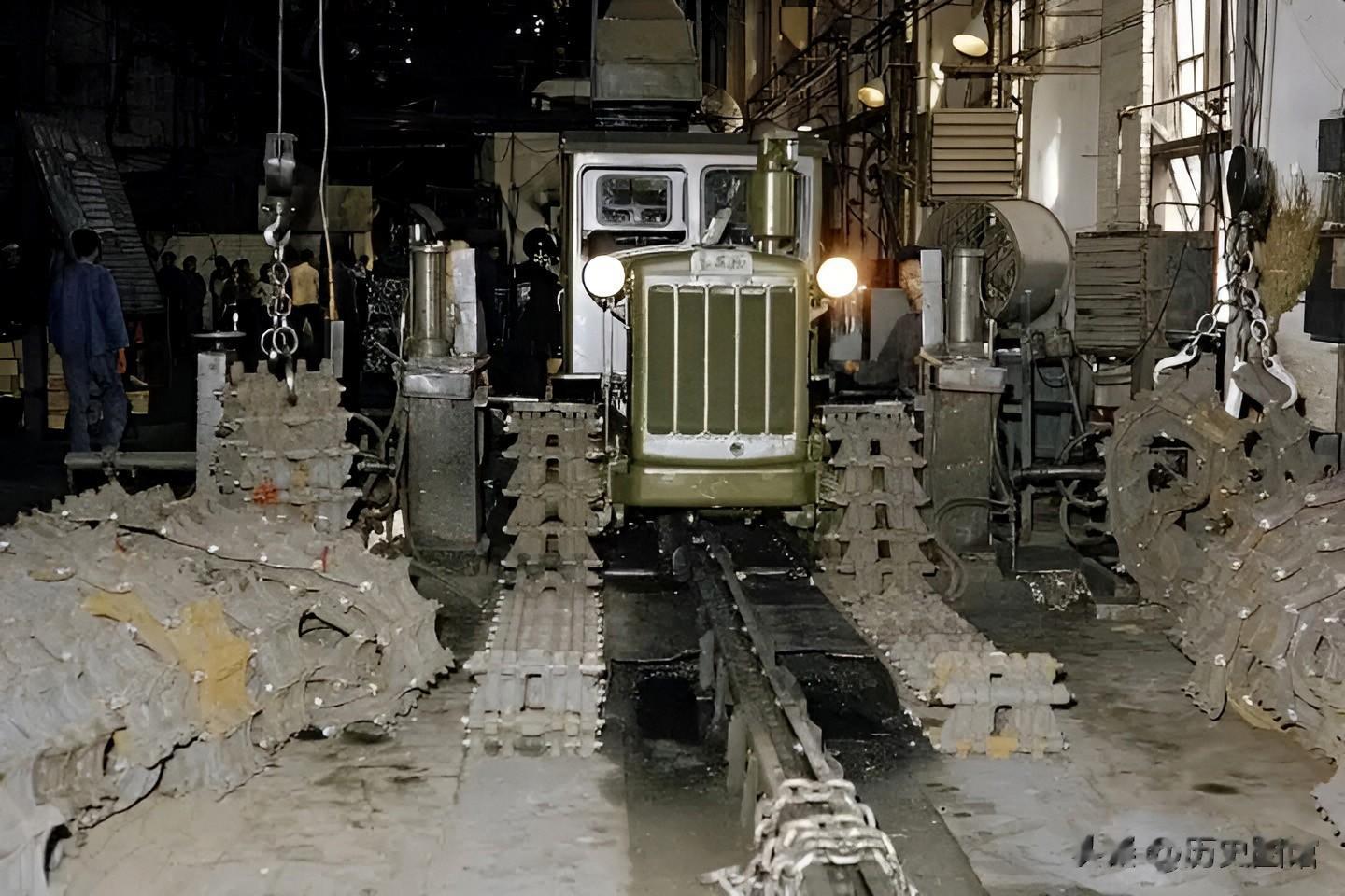 作为新中国第一个五年计划的重点建设工程,中国一拖肩负着推动农业机械化进程的重要国家战略使命。照片中,在装配车间,工人们正在给拖拉机安装履带。