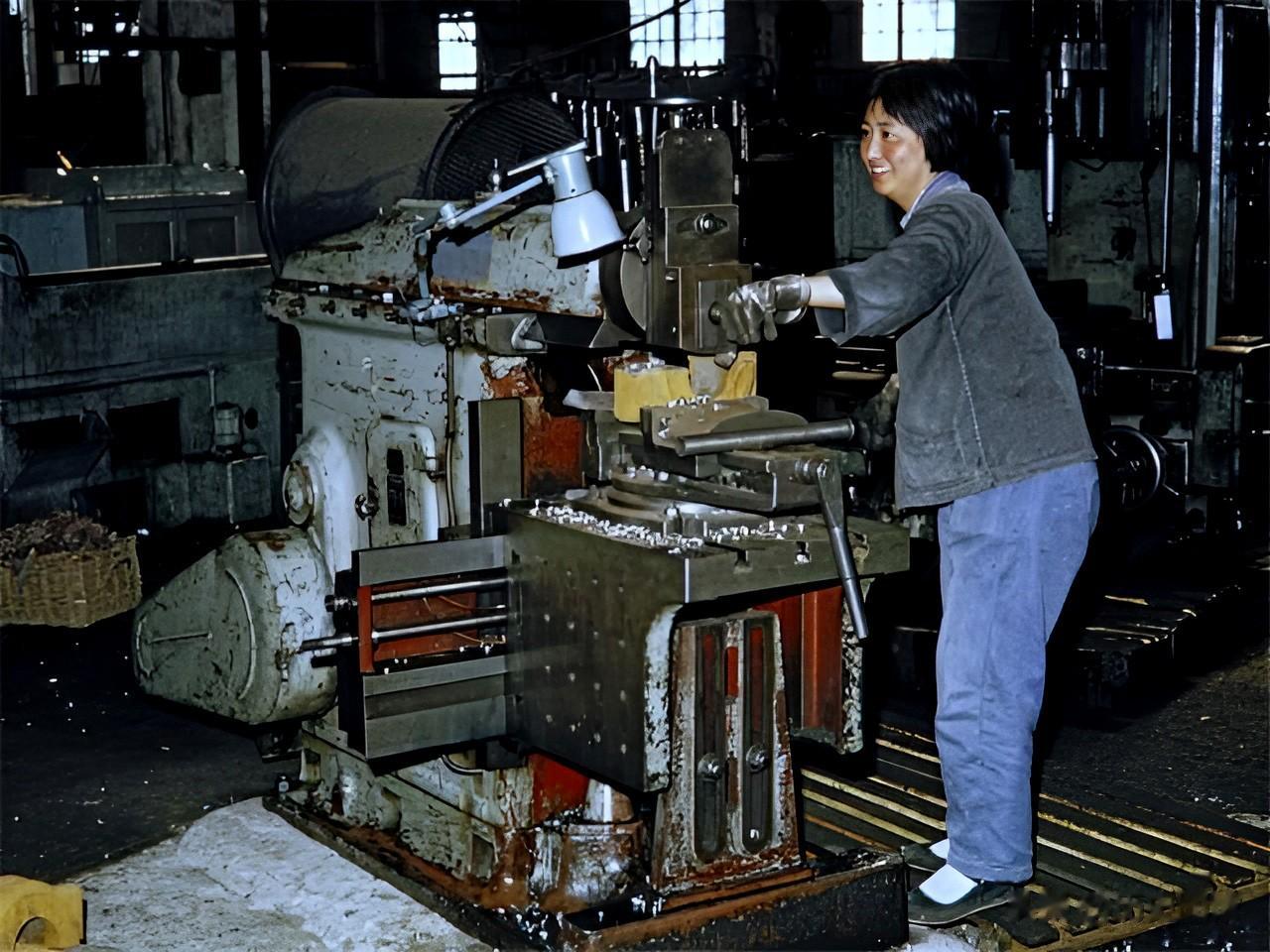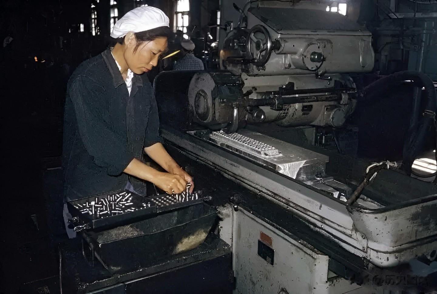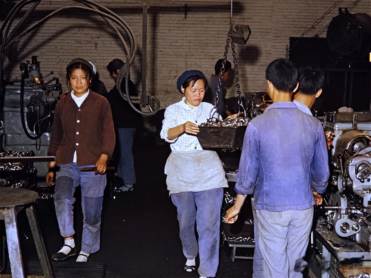 车间里工人们正在有条不紊地工作。女工们不怕脏不怕累,展现出了主人翁责任感。其中一名女工人的裤子上还有两个大补丁。