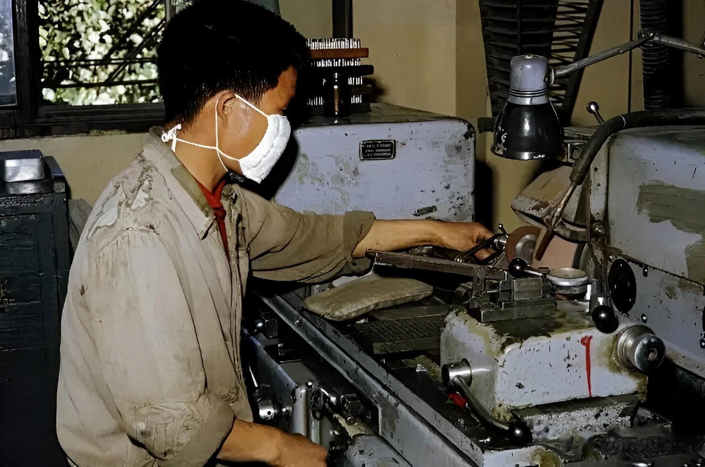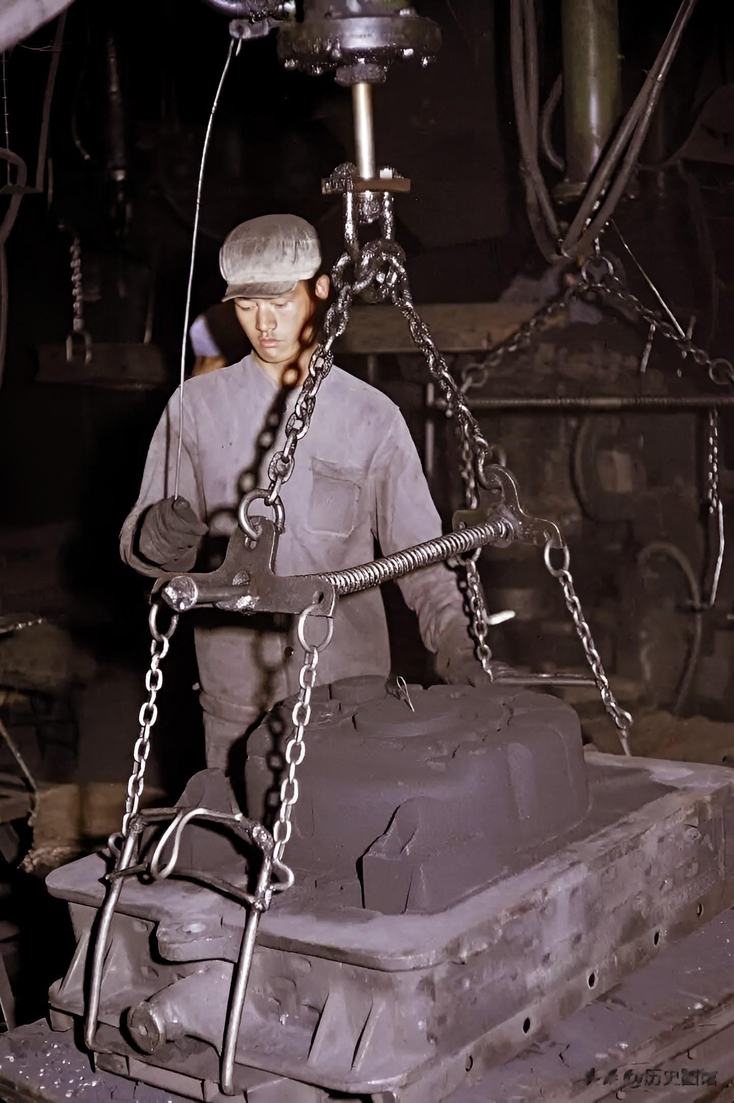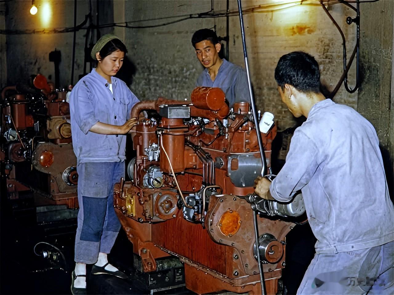 车间里工人们正在有条不紊地工作。女工们不怕脏不怕累,展现出了主人翁责任感。其中一名女工人的裤子上还有两个大补丁。