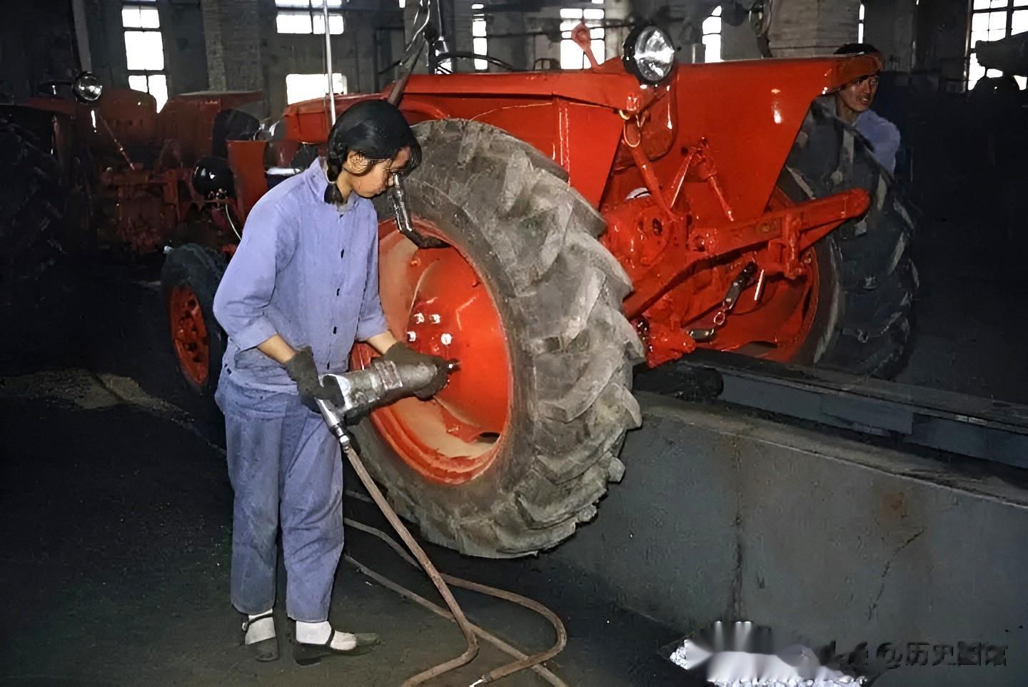在一个组装车间里,女工人正在完成拖拉机轮毂螺丝的紧固。生产中的各道工序都紧密衔接,形成了高效协同的生产链条。