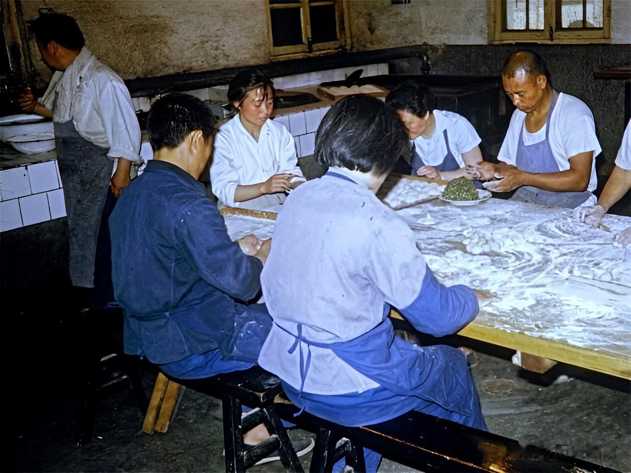 厂区配套设有标准化食堂,照片中几名厨师正坐在桌子前包饺子。物资匮乏的年代,能够提供这样的伙食条件,是非常不错的。