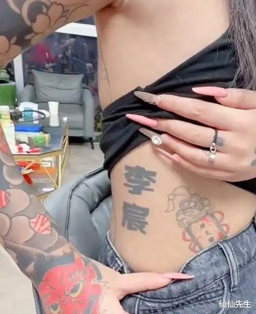 而在两条大花手臂之下,手背之上,纹有“廉秋实”,侧腰处纹着“李宸”,而另一侧腰腹处则纹了一个“泽”字,乔乔解释这是为了对称,同样他俩也是前男友。