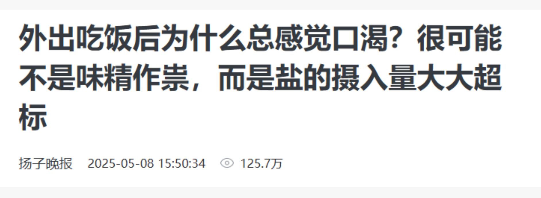 信息来源:扬子晚报 外出吃饭后为什么总感觉口渴?很可能不是味精作祟,而是盐的摄入量大大超标 2025-5-8