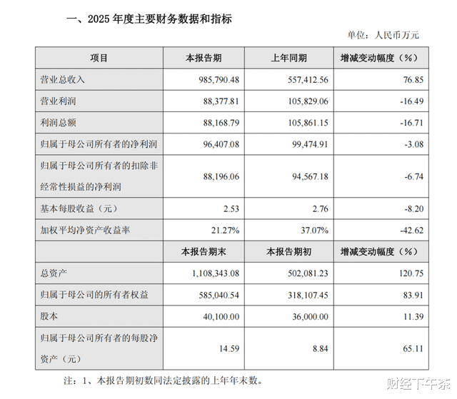 据公司披露的2025年度业绩快报,报告期内,公司实现营业收入98.6亿元,同比增长76.85%;实现归属于母公司所有者的净利润9.6亿元,同比降低3.08%;实现归母扣非净利润8.8亿元,同比降低6.74%。盈利是低于此前市场的普遍预期的。