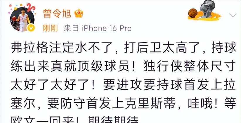 本场比赛独行侠队的状元弗拉格出场14分钟,三分球三投两中,全场比赛得到10分6篮板三次助攻并且送出一次盖帽!这名新秀非常全面!赛后篮球专家曾令旭也第一时间发表了自己的看法,他觉得弗拉格这位状元不会是水货!