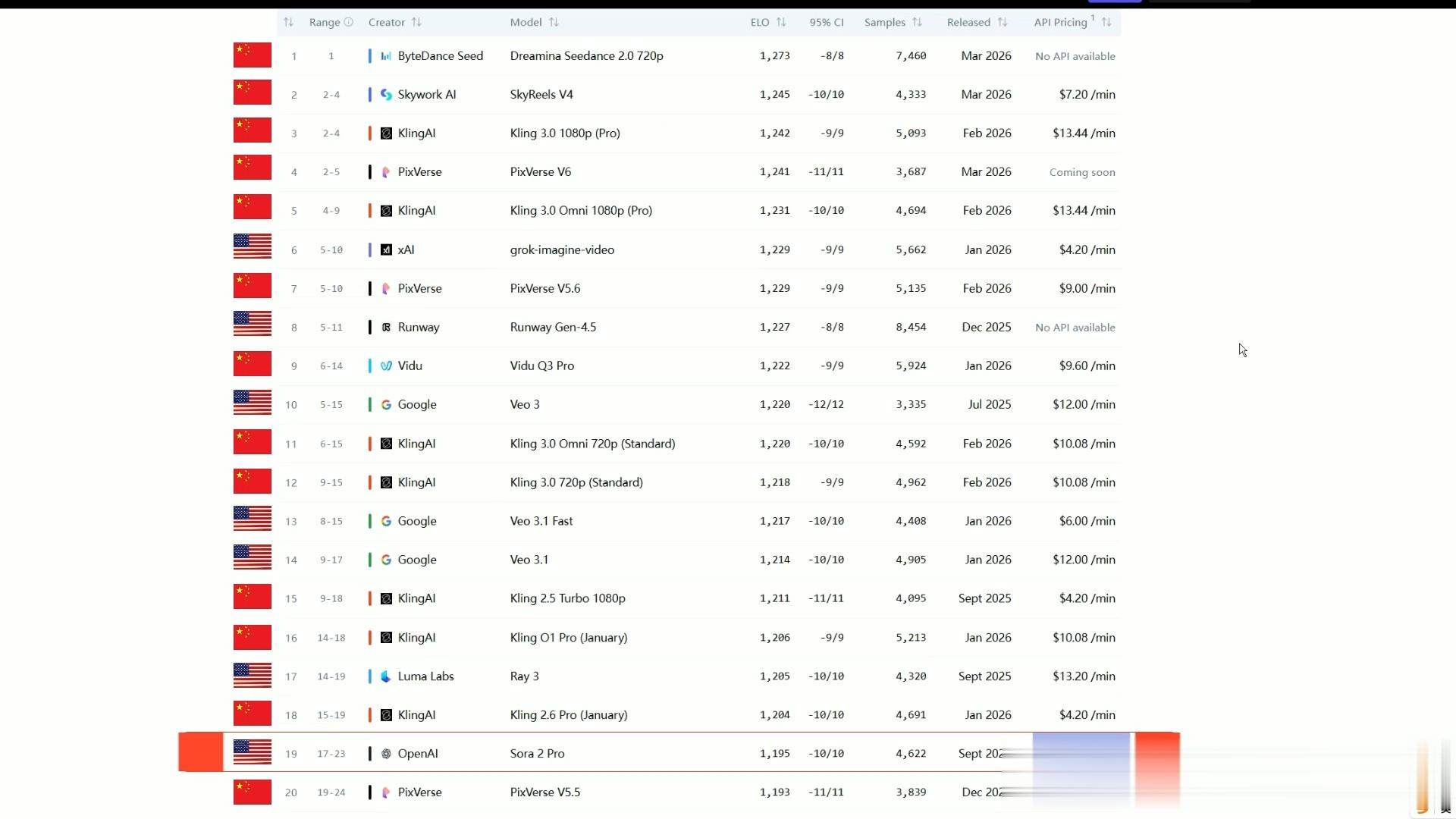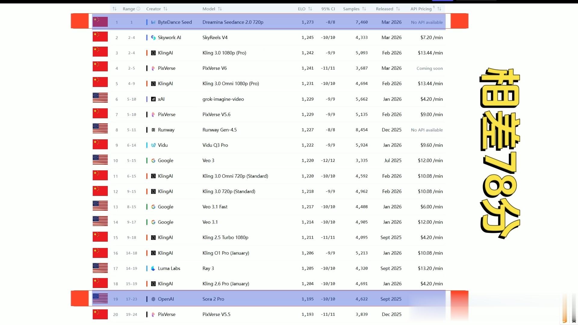 Sora 2 Pro排名第19位,ELO评分仅为1195分,与榜首的Seedance 2.0相差整整78分;甚至连2025年9月发布的快手Kling 2.5Turbo旧版本(1211 分),评分都高于Sora。