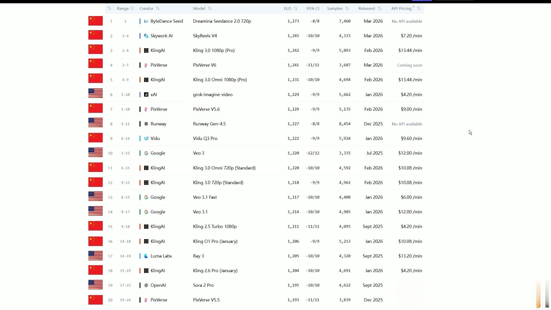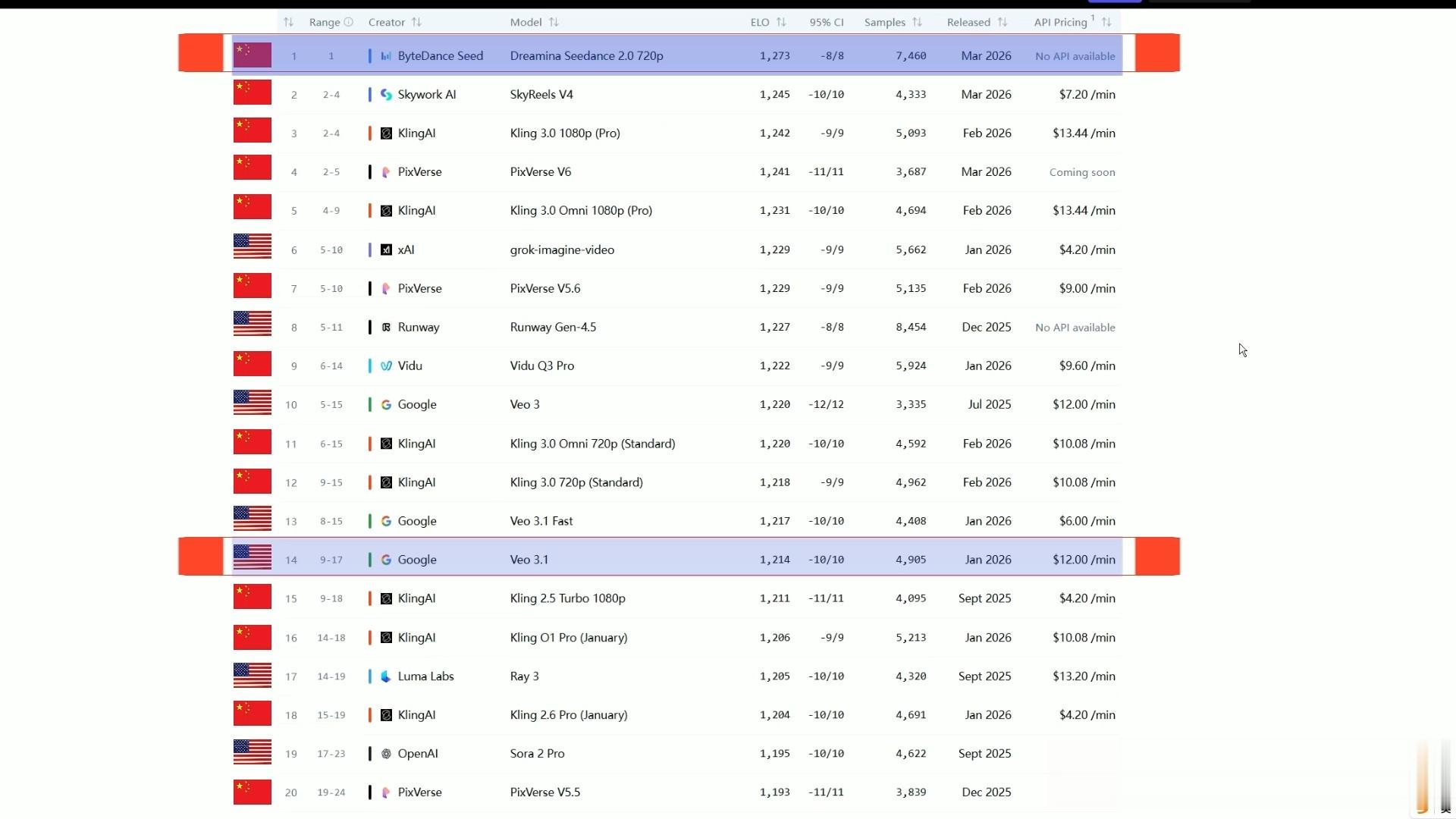 从图中我们可以清晰的看到,榜单前20名中,有13名被中国模型占据,所以那些指望中国模型也跟着sora陪葬的土殖可以洗洗睡了。