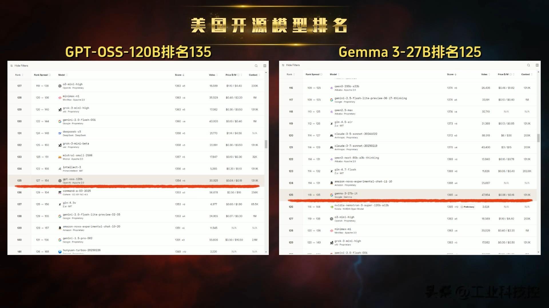 第三镖,送给这位美国IP的润人:天天黑中国套壳,结果2025年openai和谷歌开源的所谓最强模型GPT-OSS-120B、Gemma 3-27B,在全球大模型榜单里分别只排到了135名和125名...