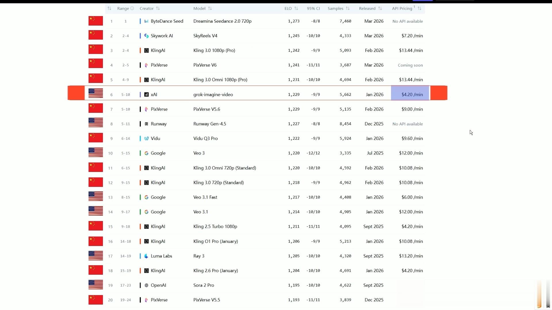 同是美国公司的产品,排名第6的马斯克grok-imagine-video,定价只有4.2美元/分钟,还有排名第10的谷歌Veo 3只要12美元/min。