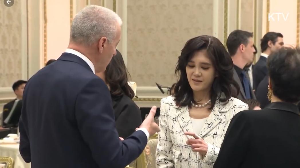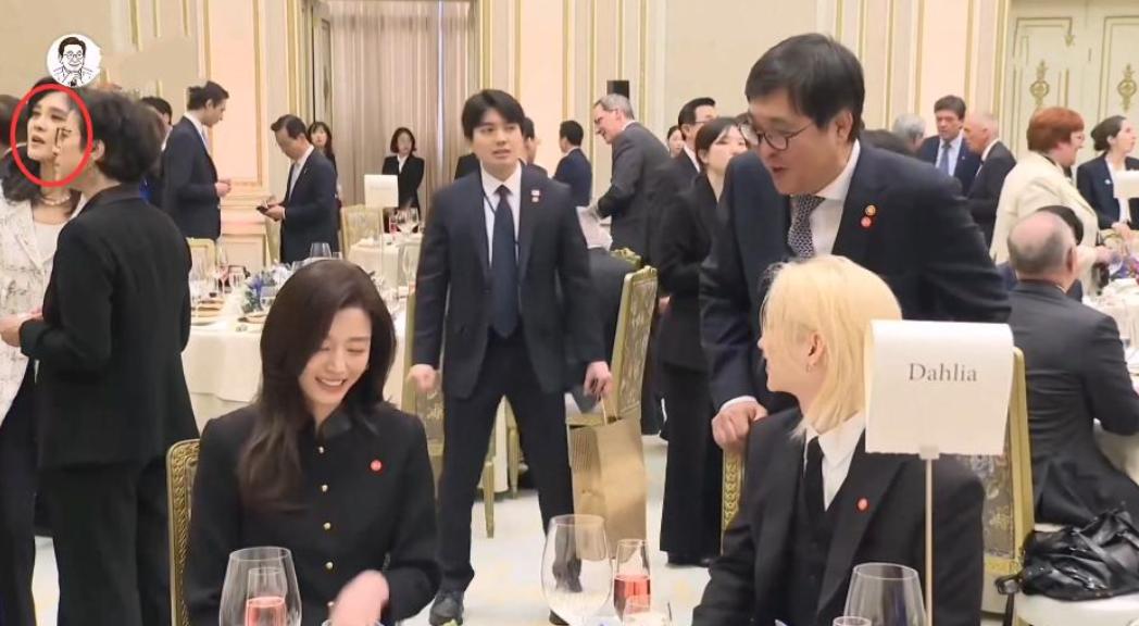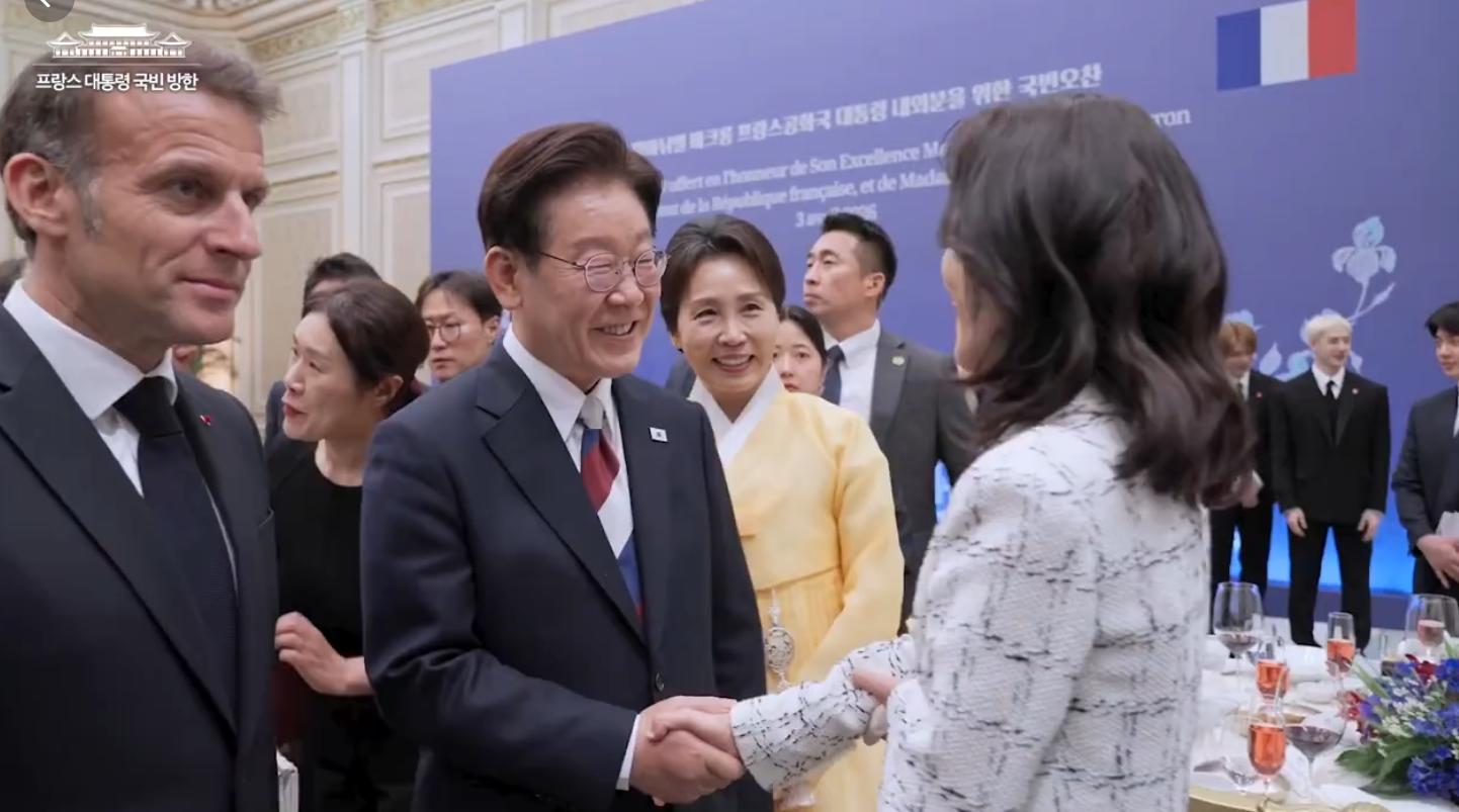 宴会正式开始,韩国总统夫妇与法国总统夫妇到场,然后李在明领着马克龙去见韩国企业家,李富真就是其中之一。