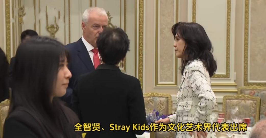 值得一提的是李富真还与女明星全智贤意外同框了,她就站在全智贤的后面与人聊天,尽管不是刻意合影,也成为欢迎法国总统宴会上的一大亮点之一。