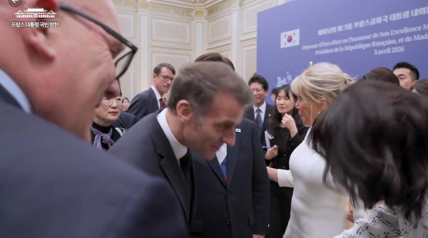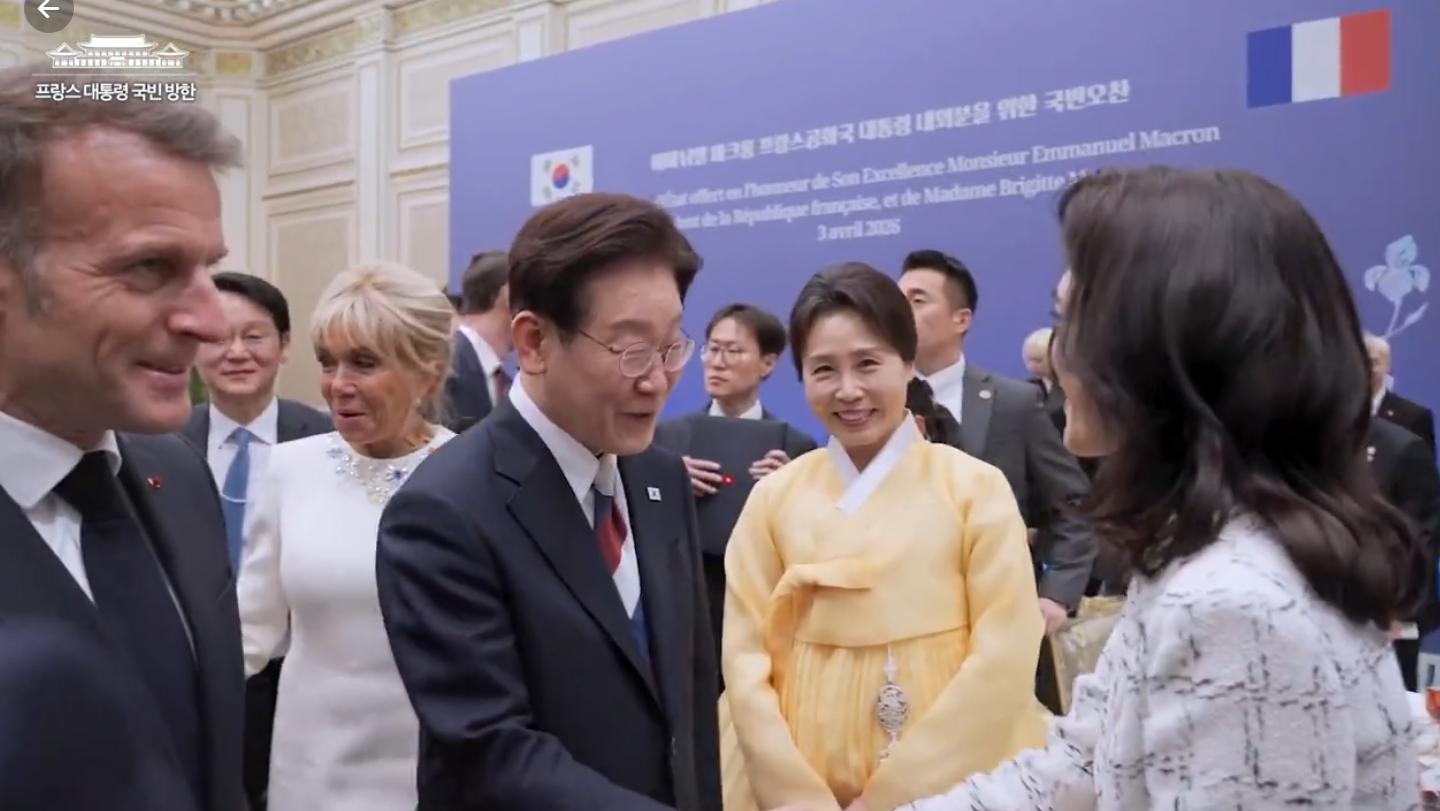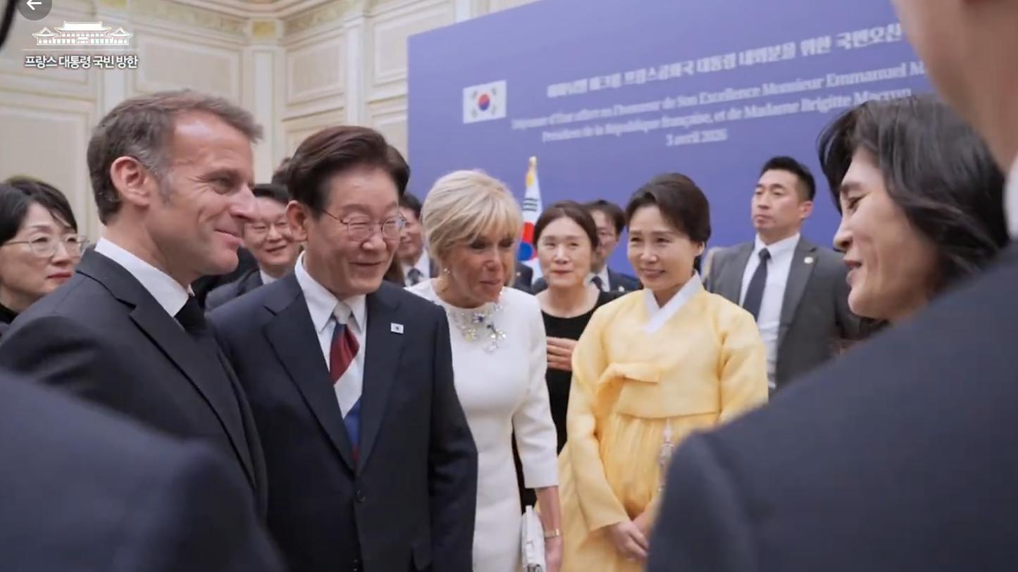 李在明把李富真介绍给马克龙,然后马克龙与布里吉特都和这位女强人聊天,不得不说56岁李富真是真的优秀,她能被韩国总统邀请参加青瓦台国宴,足以说明她的影响力不可小觑。